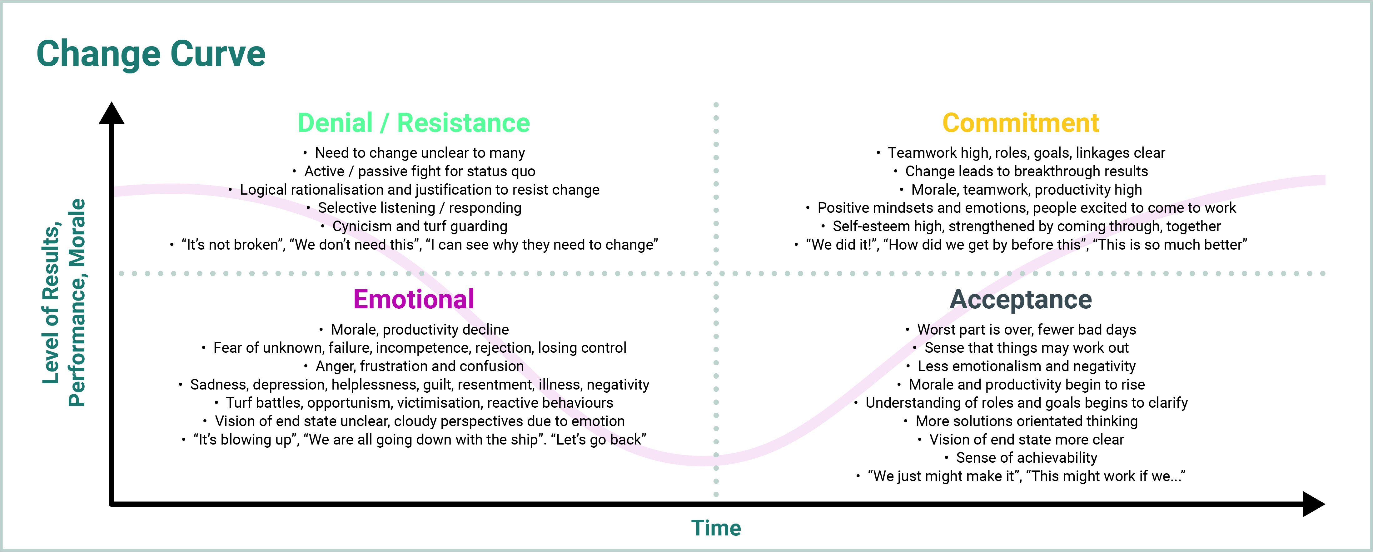 Understanding and acknowledging the mindset and morale that an individual is experiencing can help you to understand how to lead them to success. Understanding the range of emotions and responses individuals have when experiencing change is crucial as is best depicted by the Kubler-Ross Change Curve.