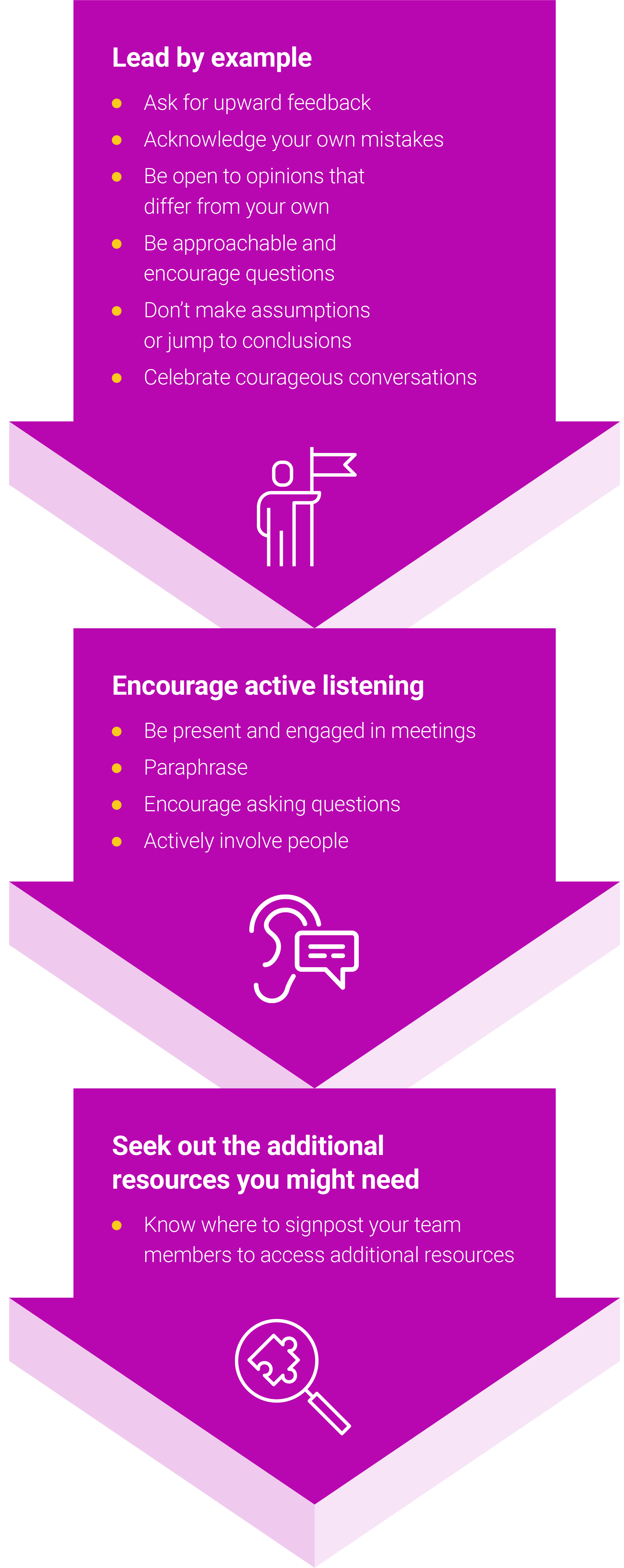 Leader approach: Progress through the steps shown earlier in this article to foster psychological safety.